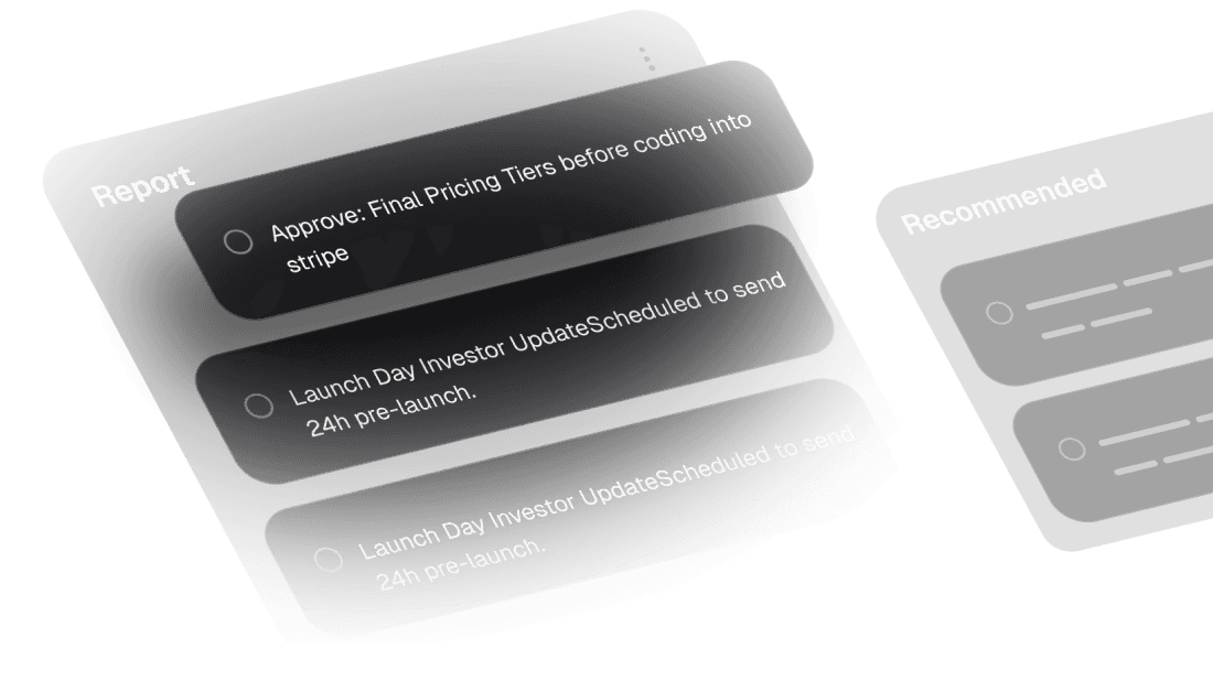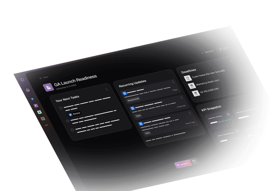 A customizable dashboard with widgets to organize decisions, goals, and blockers into a single, high-signal view tailored to your team's unique workflow.